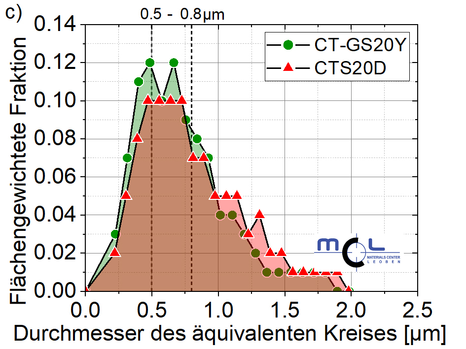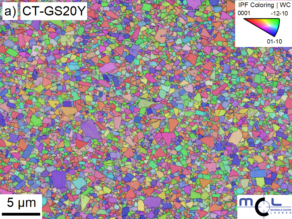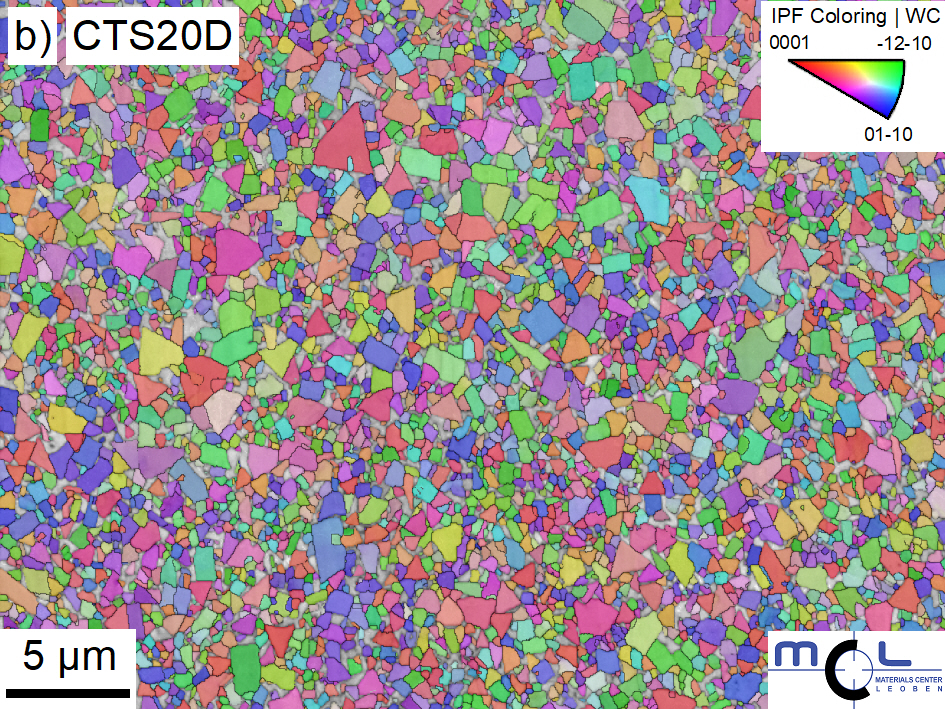 Zusätzlich wurden Elektronenrückstreubeugungsuntersuchungen (EBSD) durchgeführt, um kristallografische Information zu extrahieren: EBSD gestattet die Unterscheidung von kristallographischen Phasen und beispielsweise die Korngrößen, -orientierung und -grenzen zu charakterisieren. Die Bilder 2a) und 2b) zeigen Kristallorientierungsbilder der Wolframkarbidkörner der upGrade-Sorte CT-GS20Y und der Premiumhartmetallsorte CTS20D. Die Wolframkarbid Korngrößenverteilung beider Hartmetallsorten auf Basis der EBSD Aufnahmen ist in Bild 2c) dargestellt. Die Karbidkorngrößenverteilung zeigt eine Streuung vom Nanometerbereich bis hinauf zu vereinzelten 2,0µm großen Körnern. In beiden EBSD Aufnahmen wurden ungefähr 5000 Karbide erfasst, wobei der Großteil davon in der eingestellten Submikrongröße zwischen 0,5 und 0,8µm vorliegen.