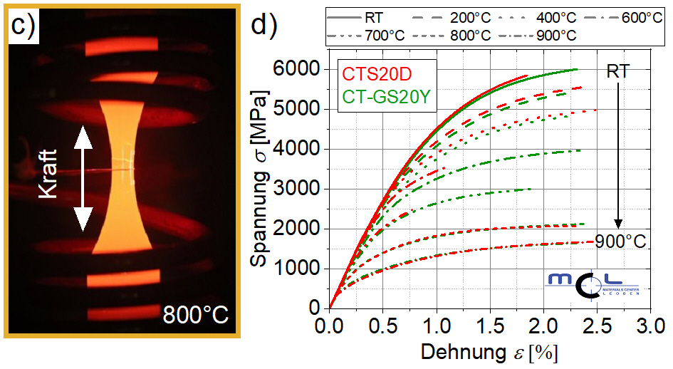 Bild 3. Servohydraulische Prüfmaschine mit Vakuumkammer am MCL, b) Einblick in die Vakuumkammer mit eingebauter Hartmetallprobe, c) bei 800°C glühende Probe und d) zeigt die Spannungs-Dehnungskurven von CTS20D und CT-GS20Y bei Raumtemperatur sowie weiteren verschiedenen Temperaturen bis hin zu 900°C unter monoton steigender Druckbelastung