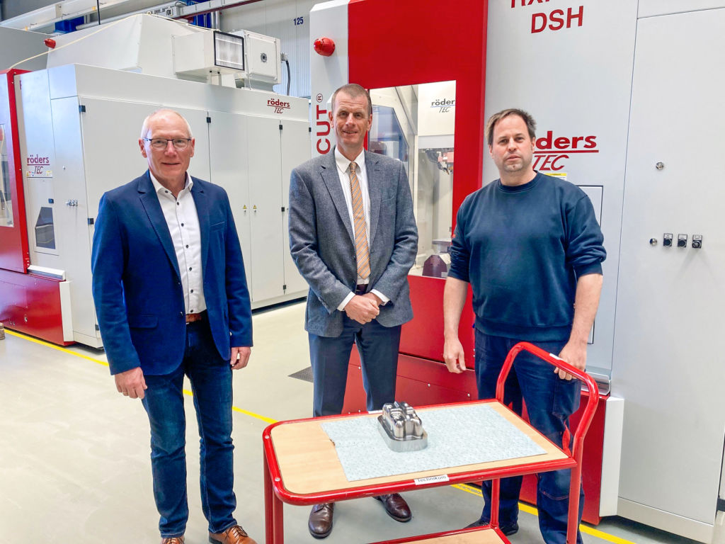Dr.-Ing. Oliver Gossel, Vertriebsleiter Maschinenbau bei Röders (Mitte), mit Gebietsverkaufsleiter Mapal Karsten Wolff (l.) und Mario Wilkemeyer, Leiter Technikum bei Röders. – Bild: MAPAL Fabrik für Präzisionswerkzeuge Dr. Kress KG