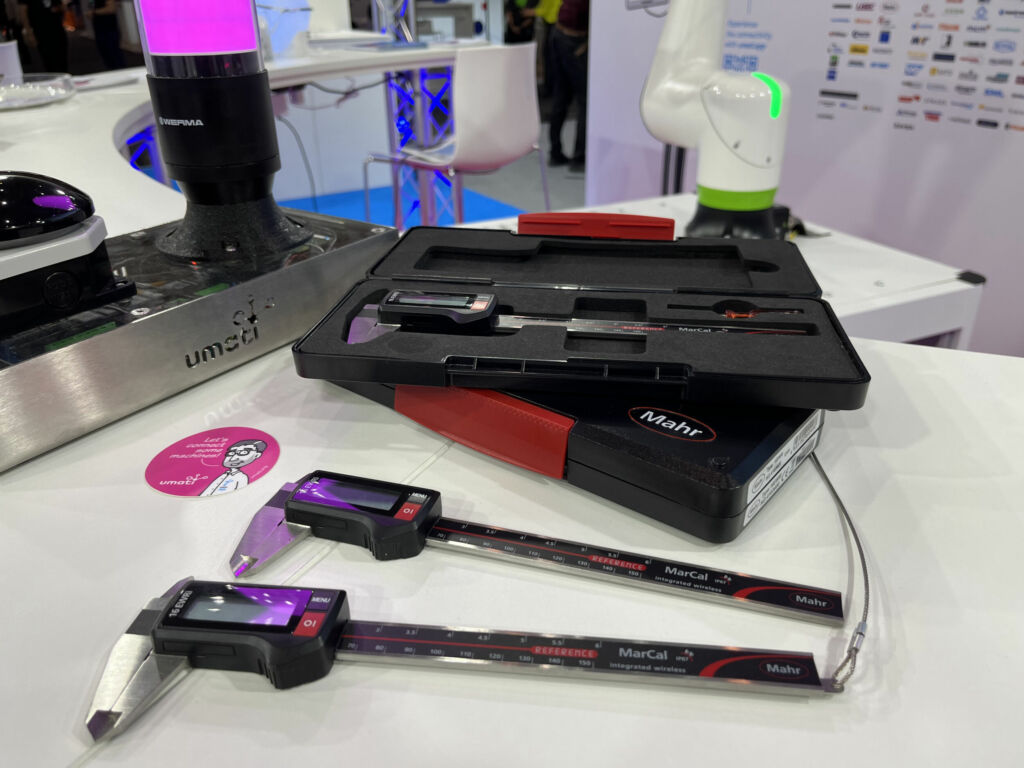Im Rahmen der EMO Hannover 2023 überreichte Mahr zwei digitale Messschieber als Leihgabe an Umati. Die handlichen Demonstratoren machen den Nutzen des Schnittstellenstandards OPC UA greifbar und werden künftig Schnittstellenstandards auf Veranstaltungen weltweit veranschaulichen. Die Messschieber werden über Bluetooth und einen Computer am Messestand mit dem Umati-Dashboard verbunden. Der Zustand der Messschieber und aktuelle Messwerte lassen sich somit online und live abrufen.