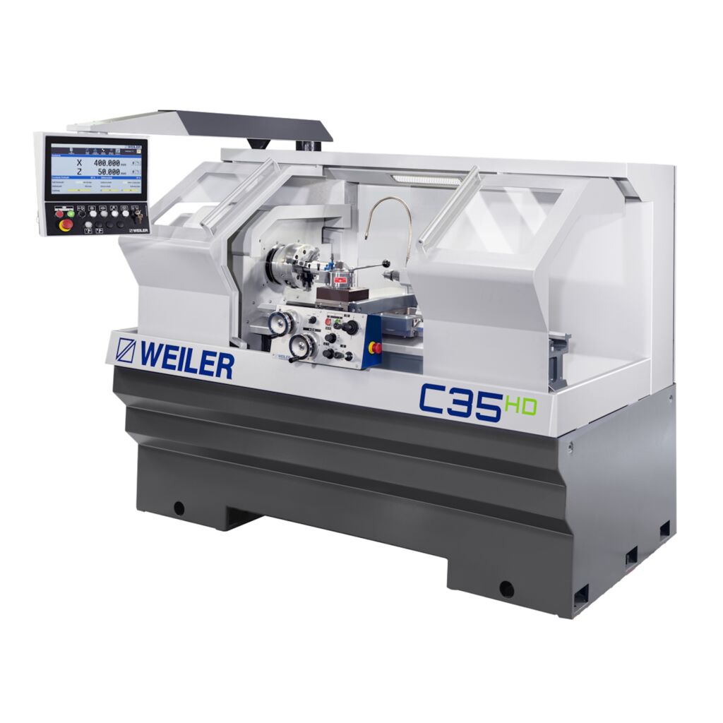 Mit der C35 HD stellt Weiler auf der Intec zudem seine aktuelle servokonventionelle Präzisions-Drehmaschine vor. Sie ist besonders kompakt gebaut, kombiniert manuelles Drehen mit vorprogrammierten Zyklen und erlaubt so die Bearbeitung komplexer Formen. Mit einem Umlaufdurchmesser über Bett von 360mm, Spitzenweiten bis zu 800mm und 180mm Spitzenhöhe deckt sie ein breites Teilespektrum ab. Die C-Baureihe ist das Bindeglied zwischen konventionellen und zyklengesteuerten Drehmaschinen und verfügt über Handräder für manuelles Arbeiten. Daneben erleichtern vorprogrammierte Einfachzyklen das Arbeiten, z.B. um Kegel, Radien und Gewinde rasch und wirtschaftlich zu drehen. Damit ist die C35 HD flexibel einsetzbar; gleichzeitig bietet sie Leistung und Energieeffizienz.
