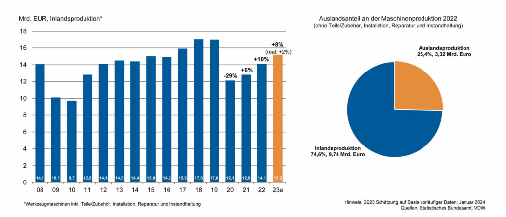Im vergangenen Jahr ist die Produktion geschätzt nominal um knapp 8 Prozent gestiegen, auf 15,2 Milliarden Euro. Real sind das aufgrund der im Jahresmittel nach wie vor hohen Inflation 2 Prozent Plus. Der Export ist um 9 Prozent gewachsen. Die Exportquote erreichte knapp 70 Prozent. Forciert wurden die Ausfuhren durch ein zweistelliges Wachstum in Amerika. Asien und Europa hingegen konnten nur einstellig zulegen.