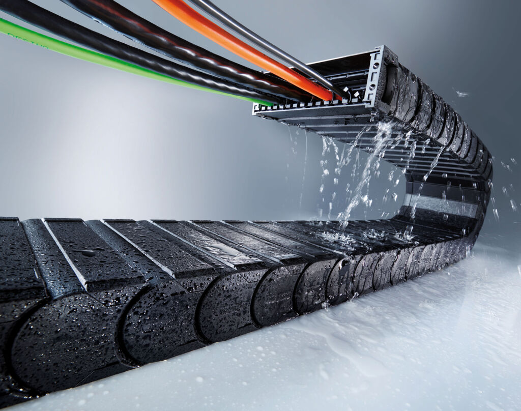 Die besonders dicht konstruierten Vollkunststoff-Ketten der TKA-Serie von Tsubaki Kabelschlepp halten Staub, Späne und Spritzwasser zuverlässig ab und verhindern so unter anderem das Eindringen von Kühl- und Schmiermitteln. Durch die Kapselung des Anschlagsystems und der Bolzen-Bohrungsverbindung sind selbst große Mengen zerstäubtes Öl und umherfliegende Teilchen bei der Reinigung des Arbeitsraums kein Problem mehr. Dieser hohe Schutz der verlegten Leitungen bis in den Anschlussbereich wurde für die Typenreihe TKA55 in den Breiten 50-175mm durch den TÜV Nord nach IP54 geprüft und bestätigt.