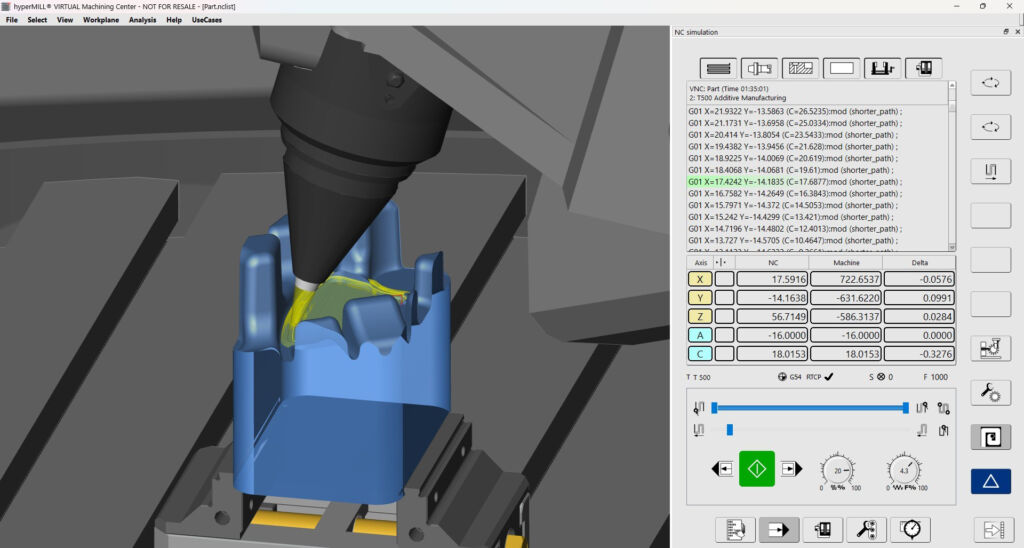 Abgesehen vom Sonderfall hybrider Maschinen verlangt die Nachbearbeitung das Ausrichten eines Rohteils mit geringem Aufmaß in der Werkzeugmaschine. In der virtuellen Maschine von Hypermill stellt Open Mind mit der Funktion ‚Best fit‘ eine innovative Alternative zur manuellen Ausrichtung von Werkstücken für die Weiterbearbeitung bereit (siehe Video). Voraussetzung ist ein 5-Achs-Fräszentrum mit digitalem Messtaster. Das nicht ausgerichtete Rohteil wird auf der Maschine mit einer 3D-Messung angetastet und das Messprotokoll an das CAM-System gesendet. Die Software gleicht den NC-Code an die reale Bauteilposition an. So wird jetzt die virtuelle Welt der Programmierung an die reale Welt der Aufspannung angepasst.
